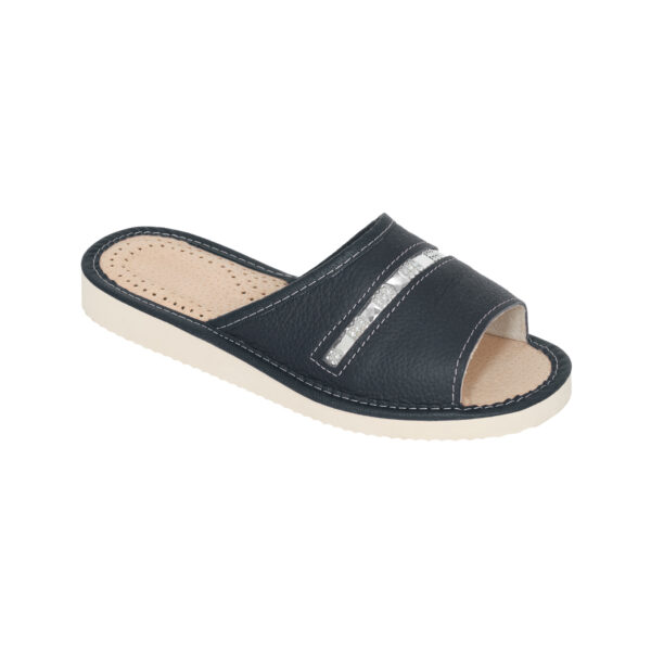 Stylowe i funkcjonalne kapcie damskie wykonane z wysokiej jakości naturalnej skóry. Głęboki, ciemnogranatowy kolor nadaje im ponadczasowego charakteru, a ozdobny pasek dodaje subtelnej elegancji. Idealne do codziennego noszenia w domu lub na tarasie.