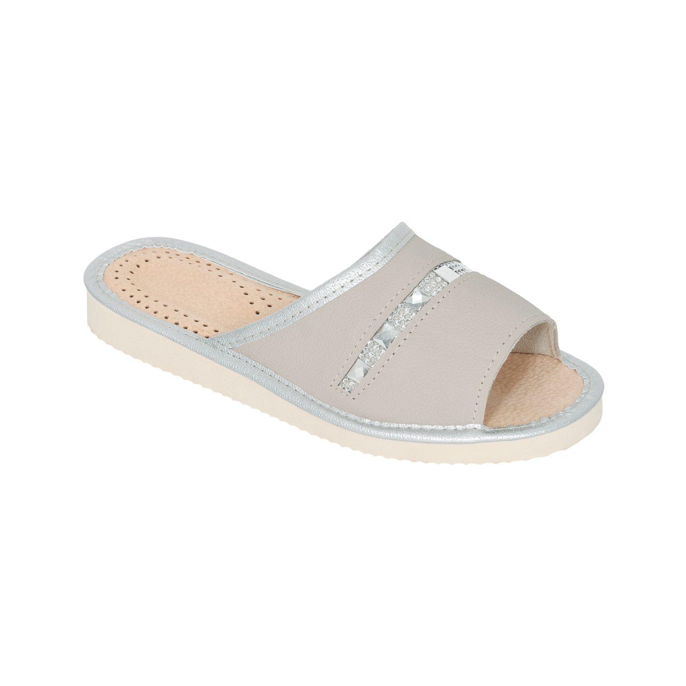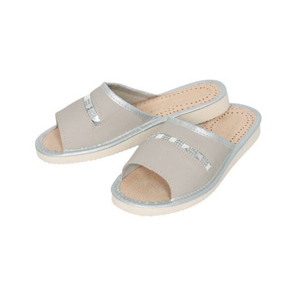 Nowoczesne i subtelne pantofle damskie w modnym jasnoszarym kolorze, wykonane z wysokiej jakości naturalnej skóry. Lekkie, oddychające i wygodne – będą idealnym dodatkiem do domowego stroju przez cały rok.