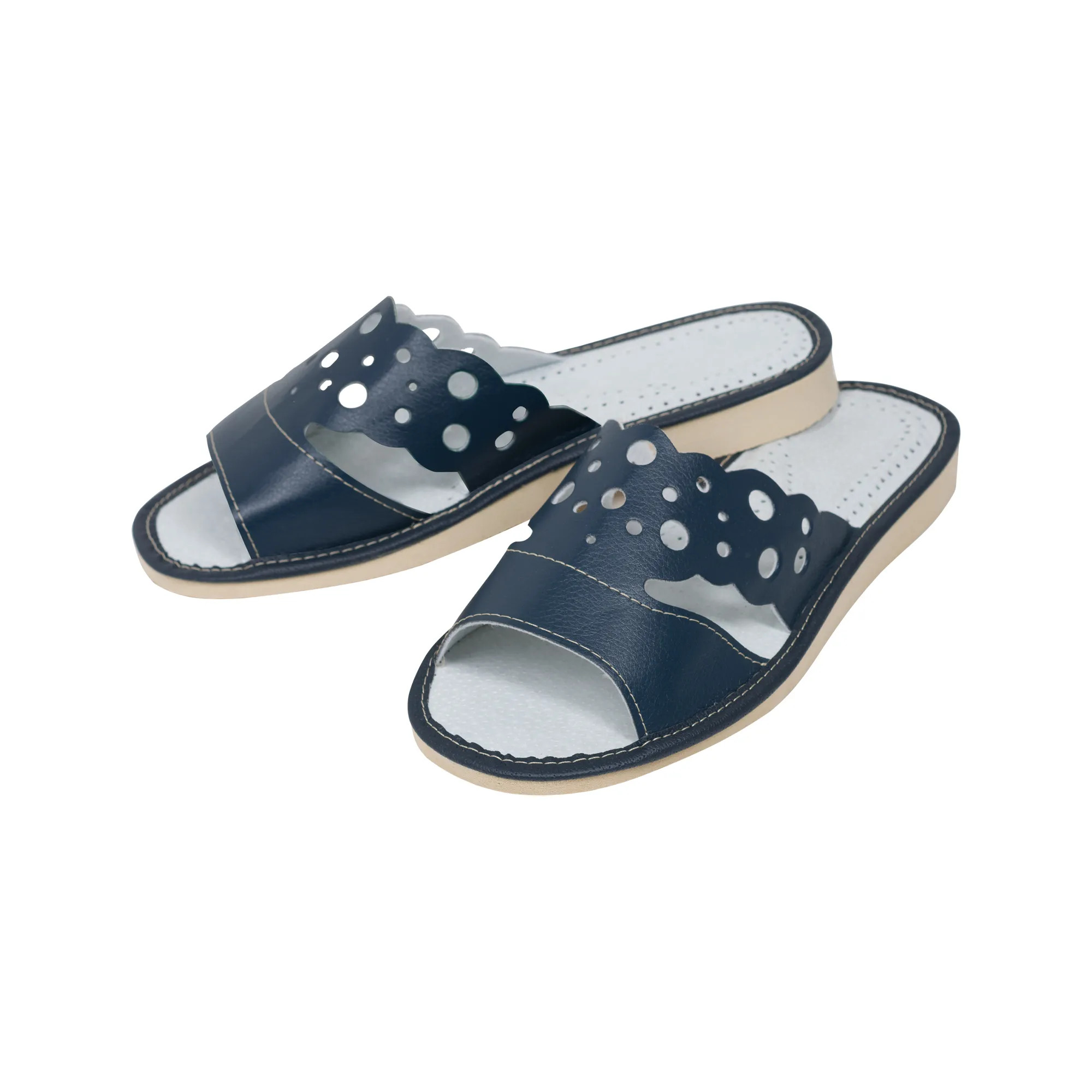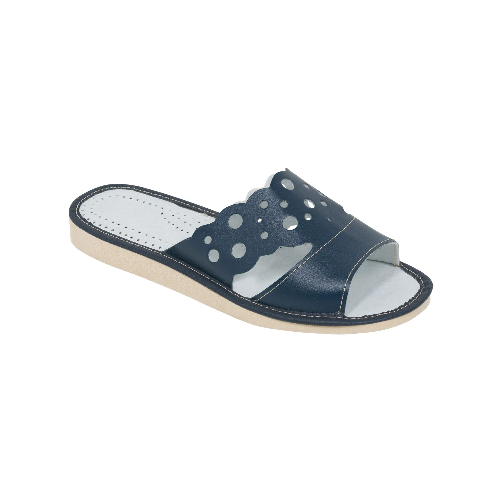 Wykonane z najwyższej jakości eko skóry w głębokim granatowym odcieniu, te kapcie zapewniają miękkość i trwałość, zachowując przy tym swój klasyczny charakter. Punktowane detalami wzór dodaje odrobinę zabawy i finezji do codziennego użytku.