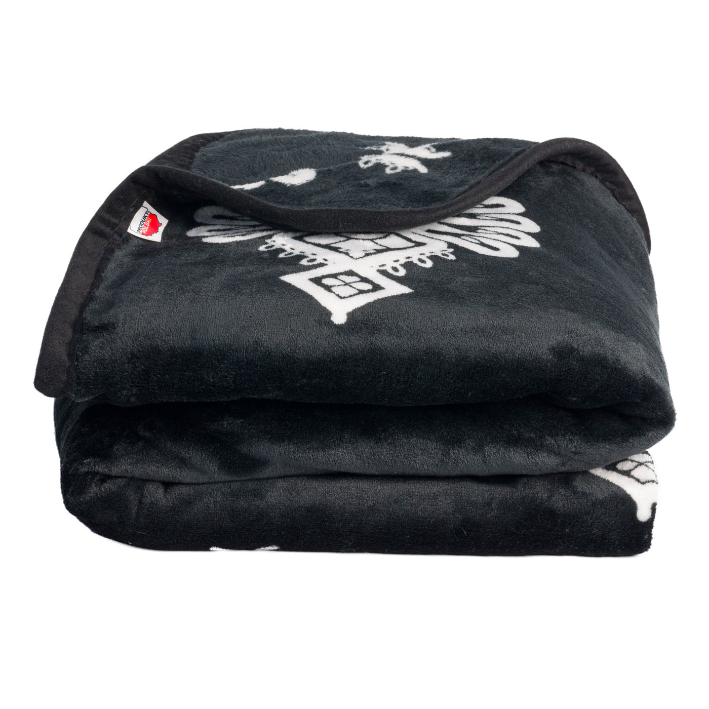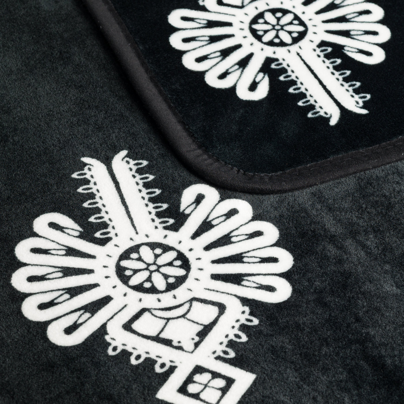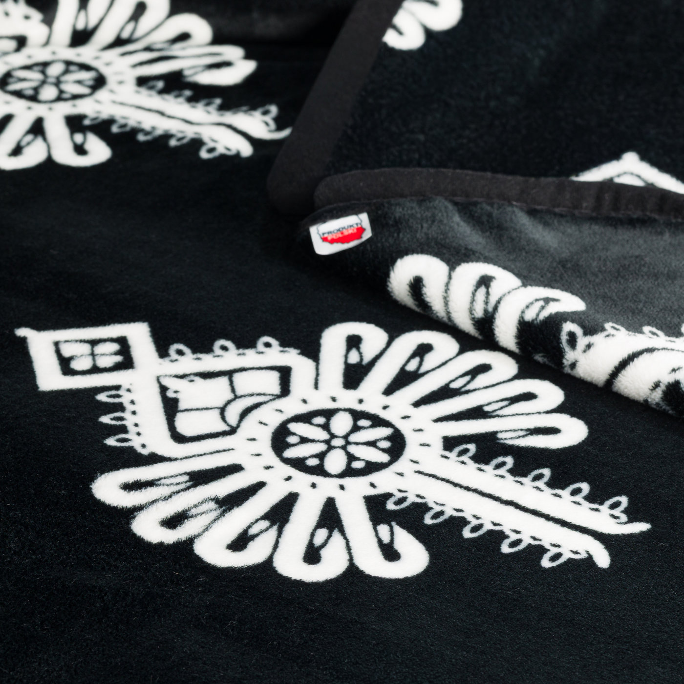 Geometryczne detale (domki, okienka) to typowa sztuka zdobnicza z Zakopanego i okolic – każdy element ma znaczenie. Biały wzór na czarnym tle działa wyraźnie, ale nie krzykliwie. Koc pasuje do nowoczesnych mieszkań, nie tylko do drewnianych chat.