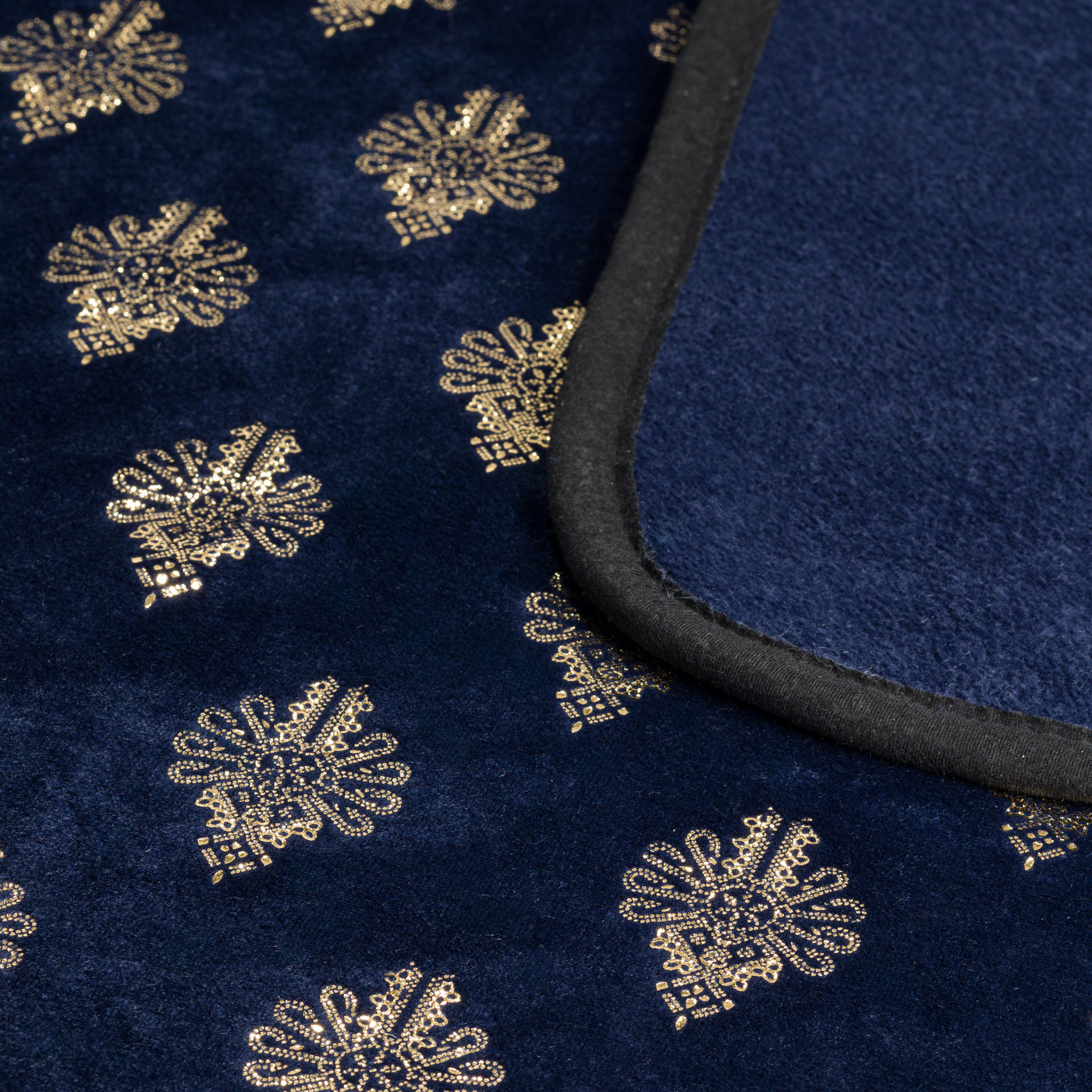 Głęboki granat (navy blue) to kolor elegancki i ponadczasowy. Pasuje do wnętrz nowoczesnych, klasycznych i glamour. Złote parzenice lśnią przy świetle – wyglądają jak drobiny złotego pyłu na ciemnym tle. To subtelny błysk, nie przesadny bling. Czarne wykończenie brzegu spina całość – koc wygląda drożej niż kosztuje.