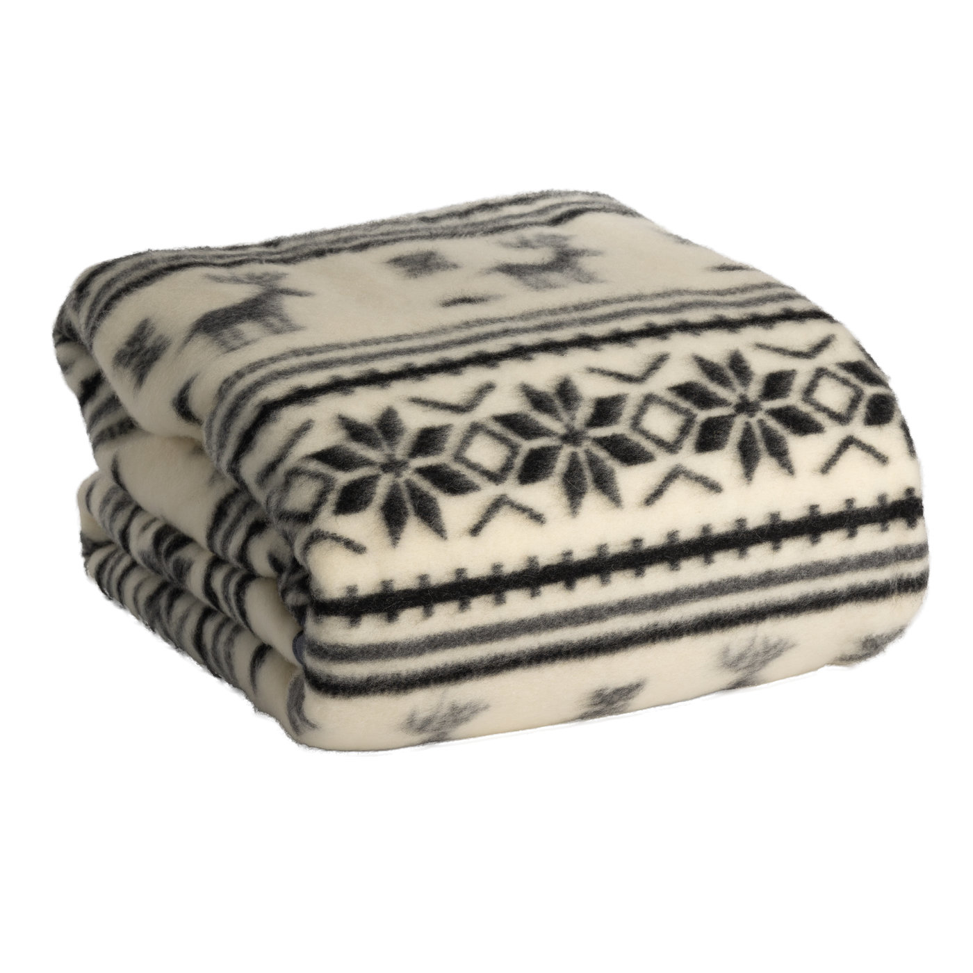 Koc wełniany z tradycyjnym wzorem góralskim – jelenie, śnieżynki i poziome pasy na kremowym tle. Domieszka naturalnej wełny owczej zapewnia ciepło i termoregulację. Rozmiar 200×160 cm. To wzór kojarzący się z Podhalem, Zakopanem i zimą w górach.