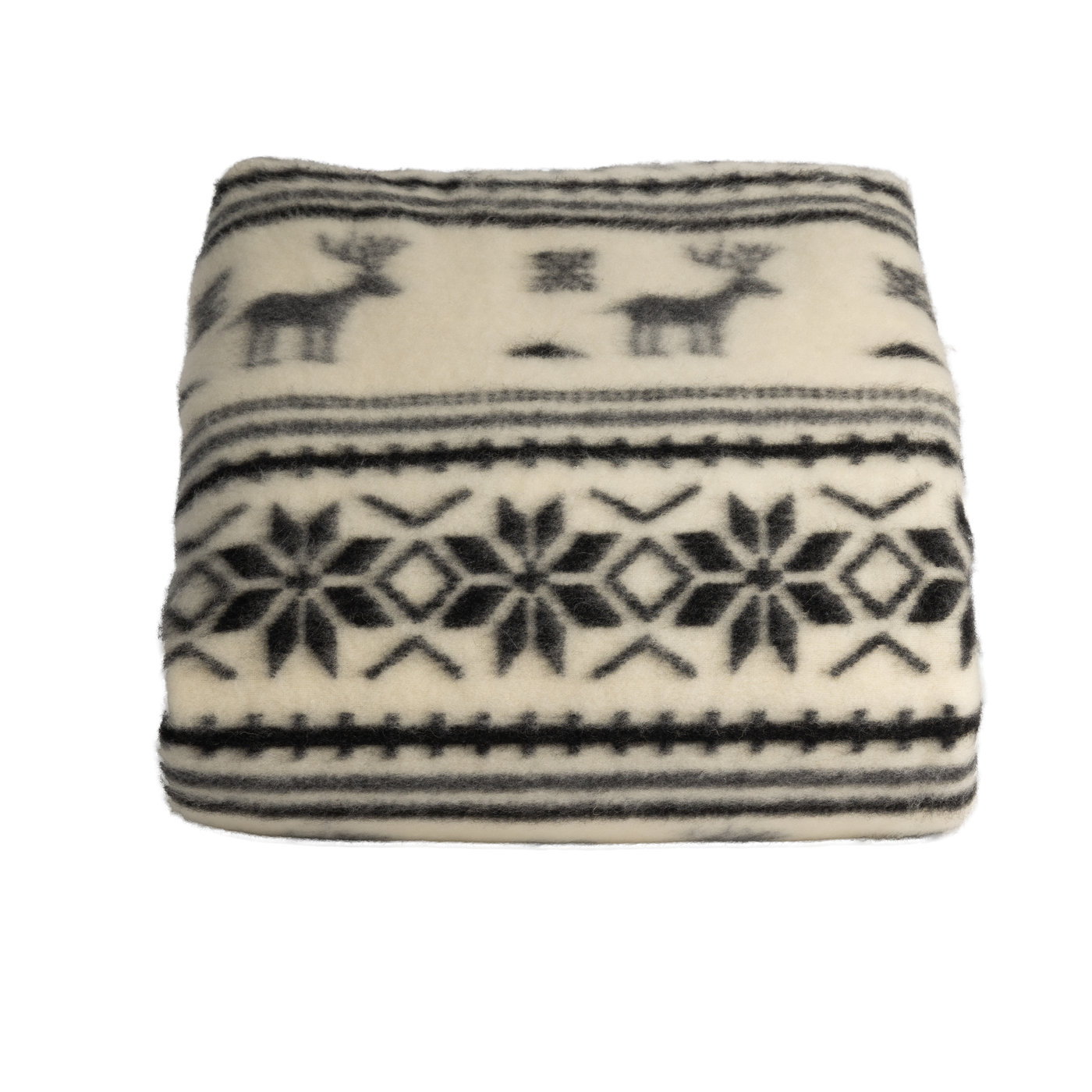 Koc zdobią charakterystyczne motywy podhalańskie. Górna część – jelenie (renifery) w biegu, środkowa część – śnieżynki ośmioramienne w stylu nordyckim, dolna część – poziome pasy i drobne geometryczne wzory. Ten układ pochodzi z tradycji Podhala i Tatr. Paleta czarno-szara na ecru wygląda klasycznie – nie jest krzykliwa, pasuje do różnych wnętrz.