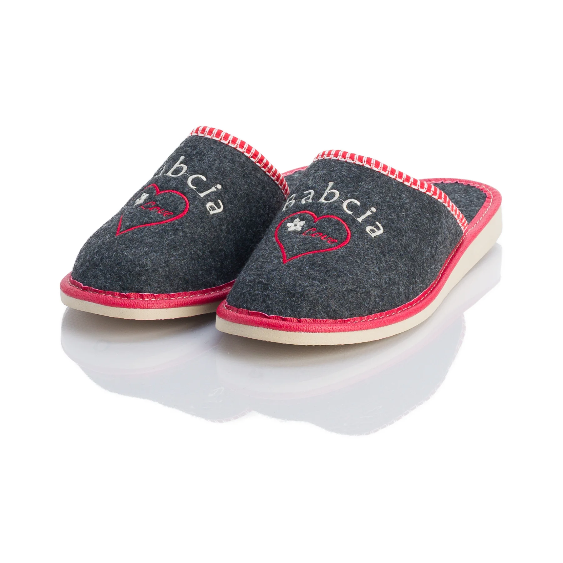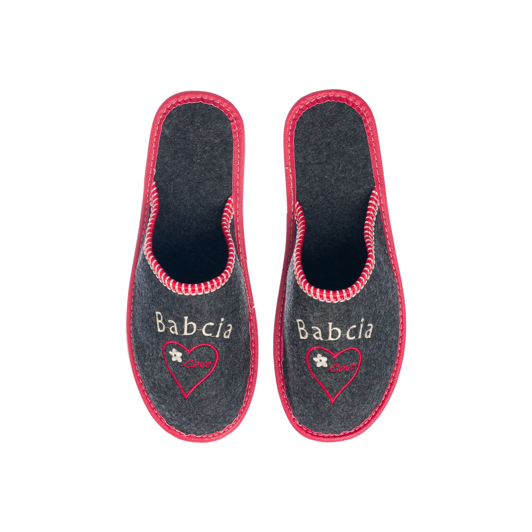 Zanurz się w komforcie i cieple dzięki naszym pantoflom z haftem „Babcia”. Delikatny szary kolor filcu pięknie kontrastuje z czerwonymi detalami, tworząc harmonijną i klasyczną kompozycję. Wyjątkowy design z sercem i dedykacyjnym napisem sprawia, że stanowią idealny prezent dla ukochanej babci.