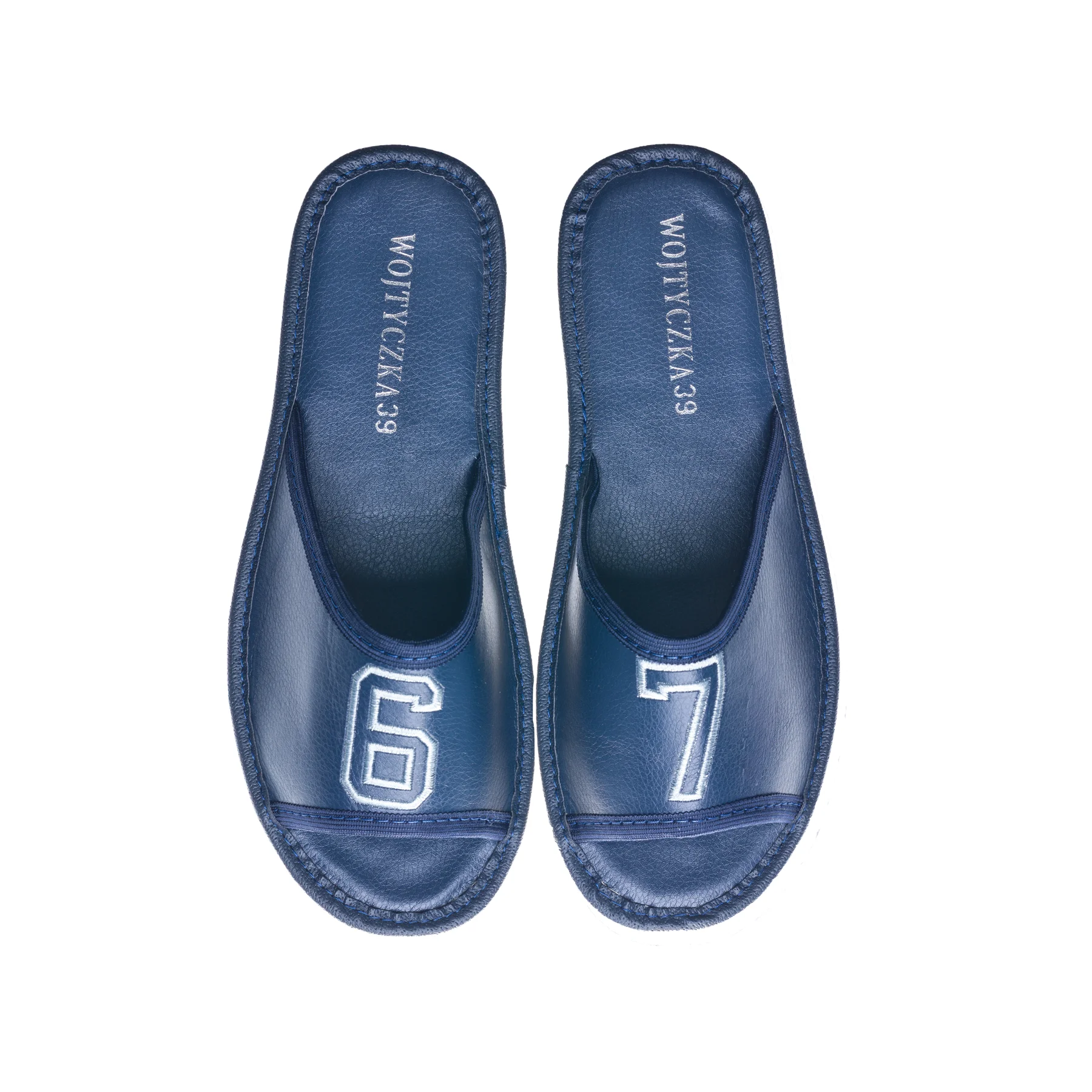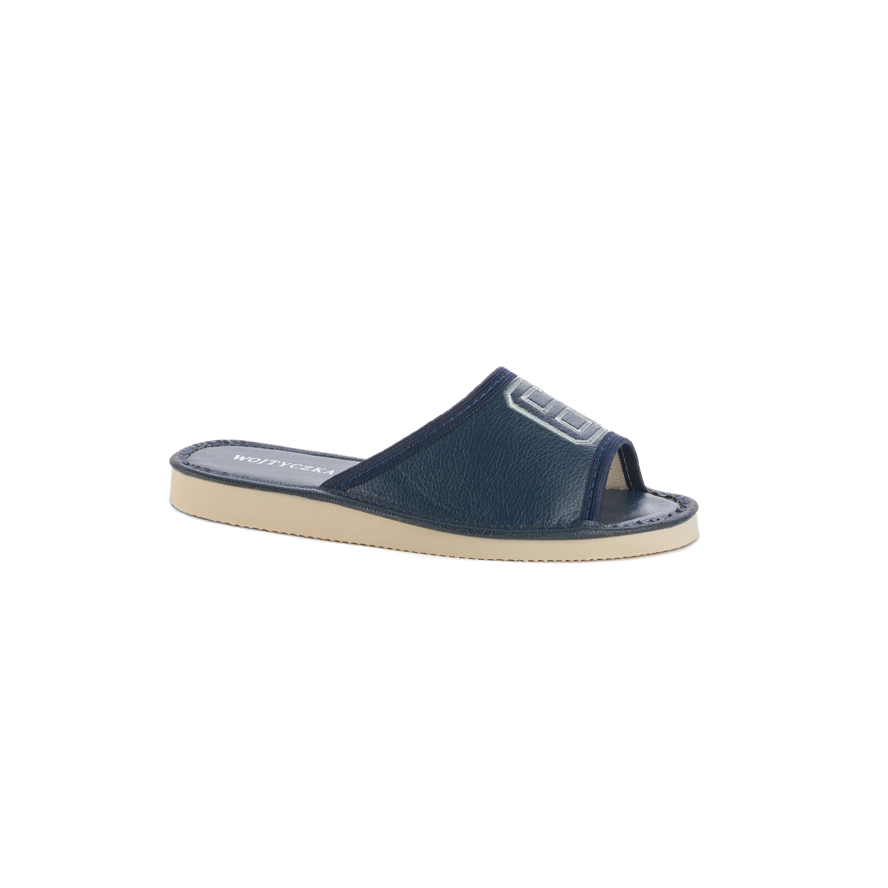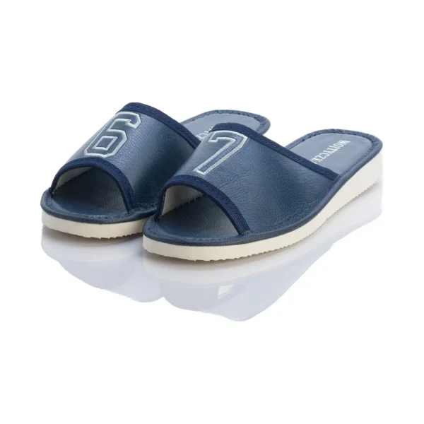 Ten model został zaprojektowany z myślą o osobach, które cenią lekkie kapcie domowe i spokojniejszą kolorystykę. Granatowa cholewka wygląda nowocześnie i schludnie, a jasny haft 67 przełamuje prostotę formy w sposób subtelny, ale zauważalny. Otwarty przód nadaje całości bardziej swobodny charakter, dzięki czemu model dobrze sprawdza się w cieplejsze dni oraz w codziennym, domowym użytkowaniu.