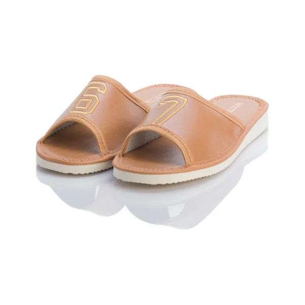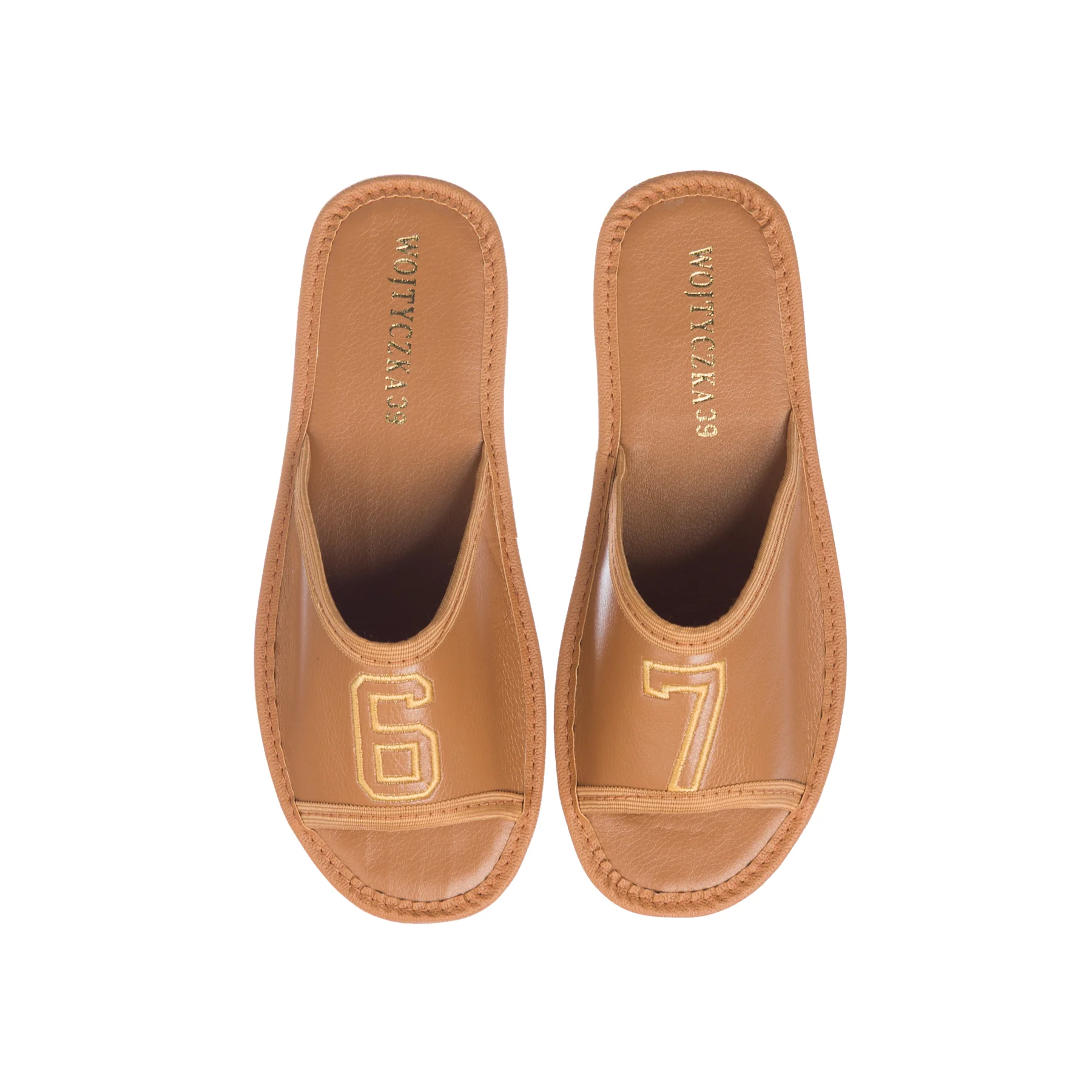 Pantofle Młodzieżowe Karmelowe 67 ze Złotym Haftem – Odkryte
